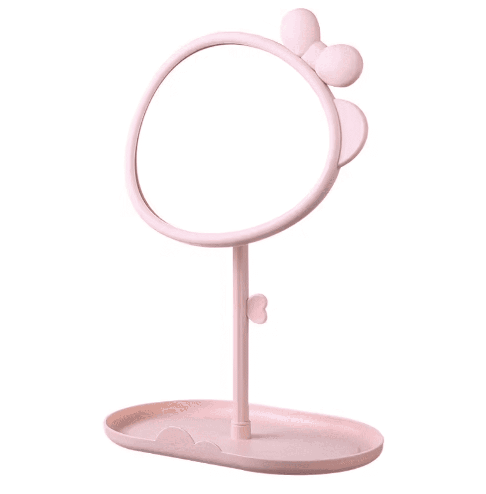 ¡Dale un toque tierno y elegante a tu tocador con este adorable espejo de maquillaje modelo Lazo!Su diseño compacto y portátil te permite llevarlo a donde vayas, ideal para uso diario o para viajes.